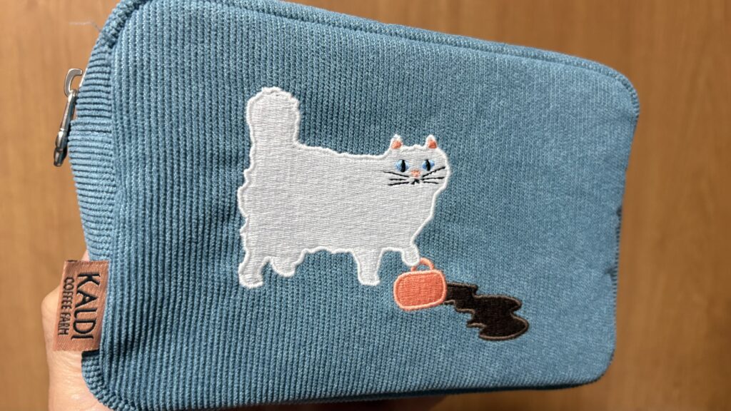 お目当てはいつものコーヒー豆だけのはずだったのですが、店内を歩いていると目に入ってきたのは、ニャンコポーチ付きのコーヒーセット。しかも、ちょうどこの日から店頭販売が始まった商品だったようです。